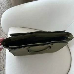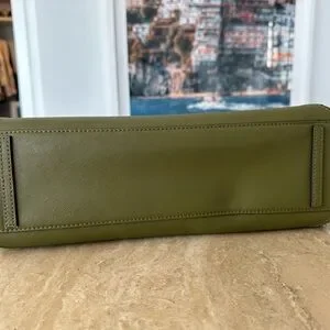Structured olive leather satchel by Tory Burch. Smooth saffiano-style finish with gold hardware. Top handles and detachable shoulder strap. Minimal logo accent for a polished look. Practical silhouette for everyday use.