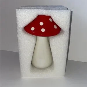 NIB SHRUMIEZ VASE. A playful red and white mushroom vase that brightens any room. The glossy red cap with white spots creates a whimsical focal point. Crafted in white ceramic for a clean, modern look. Ideal for fresh stems or decorative arrangements. Adds charming color and personality to your decor. 8” height. Smoke & pet free home.