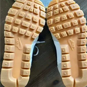 Retro-inspired Nike sneaker with cream suede overlays. White mesh upper and bold black Swoosh branding. Gum rubber outsole for classic contrast. Low-top silhouette with lace-up closure.