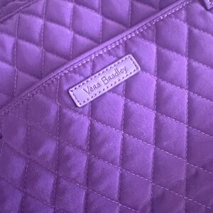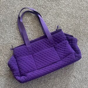 Quilted Vera Bradley travel tote in rich purple. Dual shoulder straps for carrying. Top zip closure secures contents. Spacious interior for travel items.