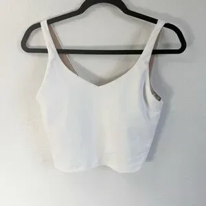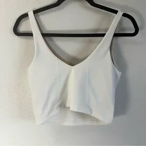Comfortable cropped tank bra top. V-neck front with wide straps. Light padding for support. Smooth, stretchy fabric. Great for layering or everyday wear.