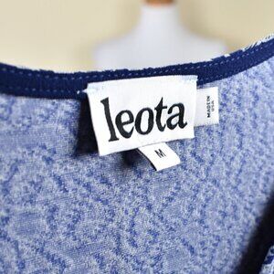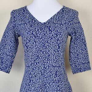 Leota jacquard printed dress. Size M. Blue and white print. Thick, stretch material. 3/4 sleeve. V-neck. Fit and flare style.