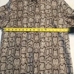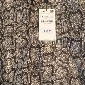 Zara short sleeve dress with snake-effect print. Crew neckline and straight shift silhouette. Neutral beige base with black pattern for easy pairing.