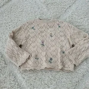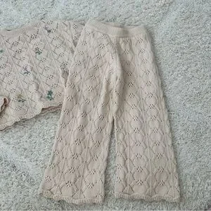 EUC! Zara spring floral crochet knit set. Includes wide leg pant and long sleeve top. The pants are lined at the top half so it’s not see-through. Pants have a small snag (photo 5).