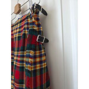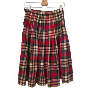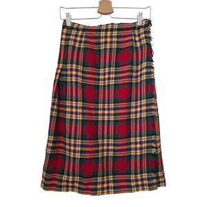 Crafted in Scotland, this Lochcarron wool kilt skirt features a vibrant tartan plaid pattern with pleats and adjustable side buckles. Ideal for traditional attire or unique wardrobe additions. No size tag: length = 24 in, waist (laying flat) = 14 in