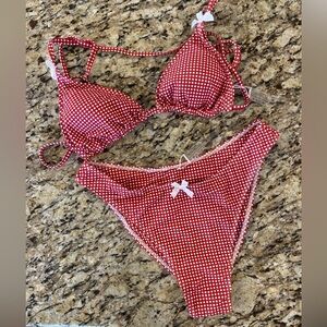 Two-piece red gingham bikini set. Triangle tie top with adjustable straps. Matching high-cut bottoms with a small white bow accent. Playful, retro-inspired swimwear.