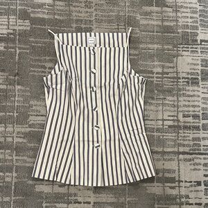 Sleeveless camisole with thin spaghetti straps. Vertical white and blue stripes create a sleek look. Front button closures offer adjustable styling. Feminine silhouette that layers easily.