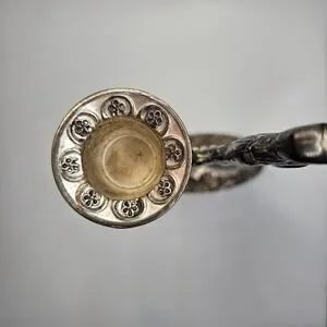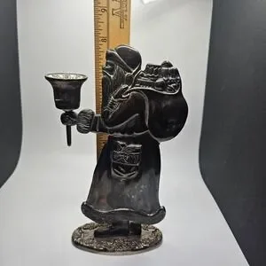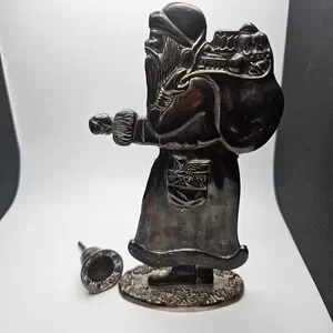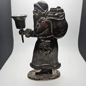 Vintage Santa Claus metal candle holder figurine featuring a classic Old World design. Santa is shown carrying a sack of toys and holding a removable single taper candle cup. Finished in an antiqued silver-tone metal with decorative detailing throughout.