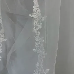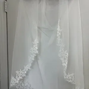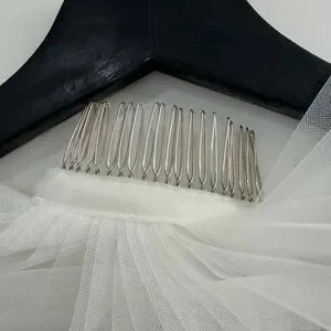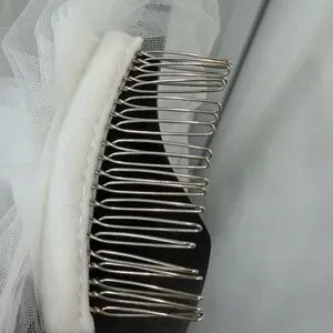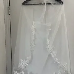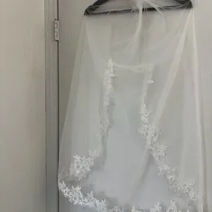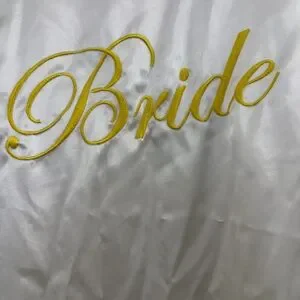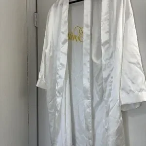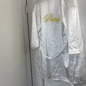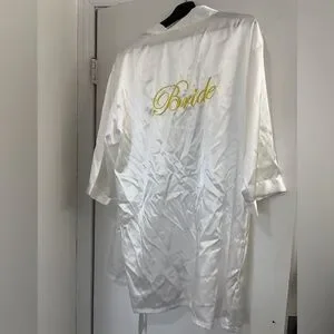 Elegant white robe with 'Bride' in gold lettering. Veil is 39inches from comb to longest point in the middle. Both items worn once. Both hand washed recently and air dried outside. Could use an steam or iron. Robe is polyester, can be machine washed. Perfect for a cute simple wedding.