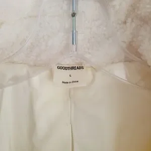 Goodthreads cream jacket with cozy sherpa lining. Soft outer fabric with warm interior for everyday wear. Classic styling that layers effortlessly. Neutral cream color pairs easily with any outfit.