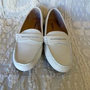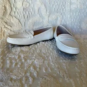 Clean white slip-on loafers with penny strap detail. Soft faux leather upper for everyday wear. Sleek rounded toe and subtle topstitching. Neutral look pairs with many outfits.