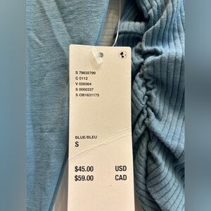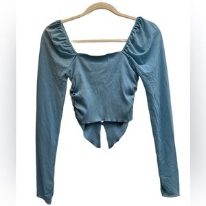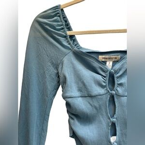 ~Featuring a ribbed bodice with peakaboo button placket at front, pretty blue color, cropped and fitted with a sweetheart neckline, semi sheer long sleeves, soft cotton blend fabric
