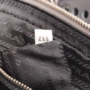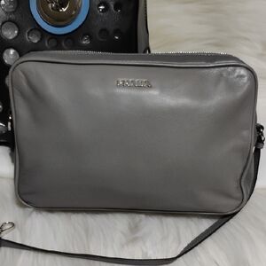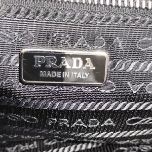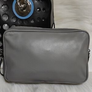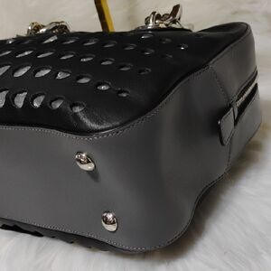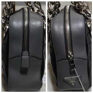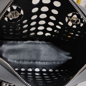 Authentic Prada City Fori Perforated Chain Shoulder bag with matching detachable leather pouch and dust bag. The dust bag is not the original one but I will add a dust bag to keep clean and from dust. Beautiful shoulder bag in black leather with circular perforated studs. Chunky silver chain handles with contrasting blue grommet accents. Includes removable gray pouch for extra storage. Modern, edgy silhouette for day or night. This beautiful bag has a zipper closure, detachable leather pouch that has a zipper closure and thick heavy silver chain handles! Very beautiful! There is a tiny place under the Prada triangle on the side of the bag as shown in pictures. Possible small scratch. That's the only real callout I can find. Please see pictures for your own review.