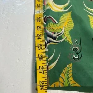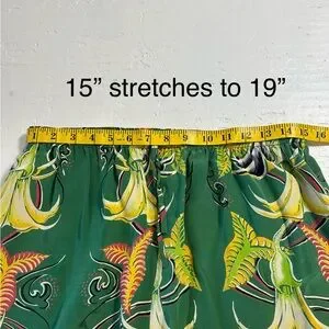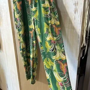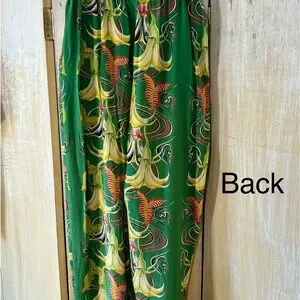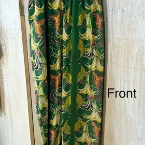 Please see photo for issues with spotting on front leg. Vintage-inspired silk pants by Avanti. Features a lush green base with vibrant floral patterns. Accents of yellow and pink add charm.