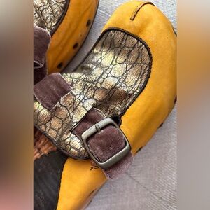 Unique mustard yellow leather flats. Metallic bronze croc-pattern vamp. Velvet brown buckle strap. Rounded toe with split-toe detail. Eye-catching mixed-material design.
