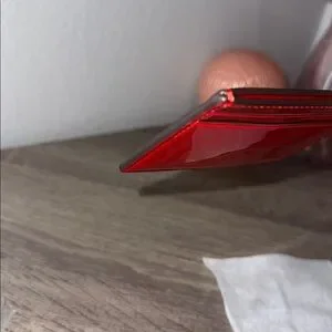 Patent Fabric. 4 exterior credit card slots. Open middle compartment. Small logo plate.