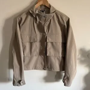 Cropped utility jacket in khaki. Designed with front flap pockets and snap-button closure for easy wear. Lightweight, versatile layering piece for everyday outfits. Neutral khaki pairs well with denim and knitwear.
