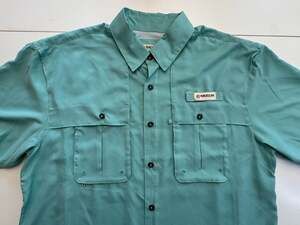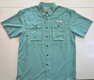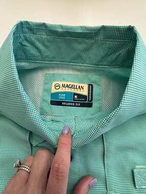 Magellan Outdoors Men's Aransas Pass Short Sleeve Fishing Shirt. Features a relaxed fit with moisture-wicking fabric and a mesh-lined back vent for breathability. This Aransas Pass heather style includes two button-down chest pockets and utility loops for your fishing gear. Excellent pre-owned condition with no stains or holes. Perfect for fishing, hiking, or casual outdoor wear. Pit to pit 28 inches. Neck to bottom 22 inches.