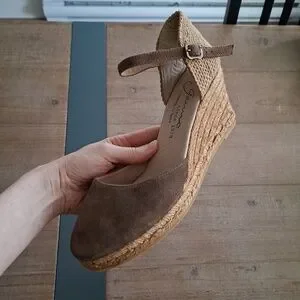 Stylish taupe suede wedge espadrille with ankle strap; classic, versatile design pairs well with casual and dressy outfits; secure buckle closure for an adjustable fit