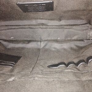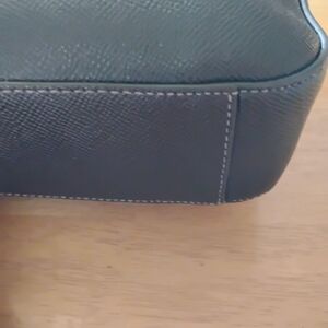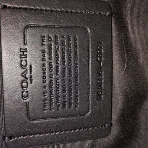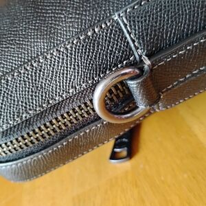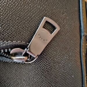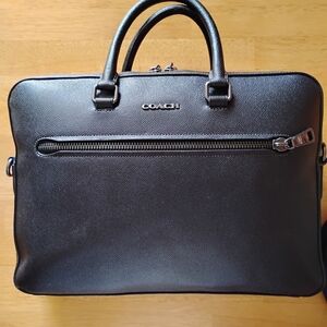 Coach leather briefcase with a front zip pocket. Top handles and structured profile. Smooth textured leather with metal logo. Zip closure secures main compartment. Professional and versatile design.