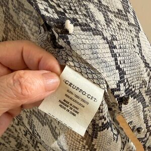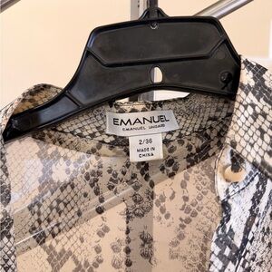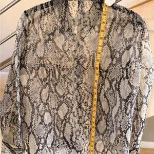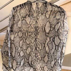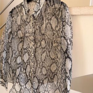 Sheer button-down blouse with an allover snake print. Classic collar and full button placket. Long sleeves with buttoned cuffs. Some rip sleeve holes, Lightweight, breezy fabric for layering.