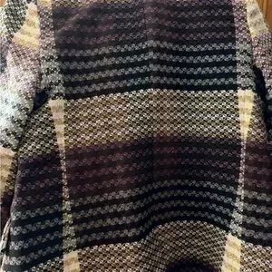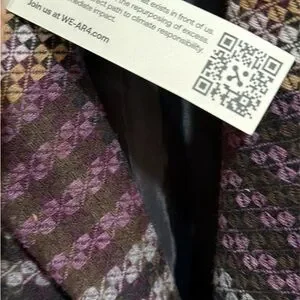 Sustainable luxury brand known for repurposed materials and elevated tailoring. This piece features a stunning textured plaid in neutral tones with purple accents — super unique and high-end look.