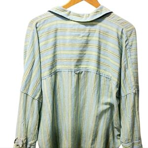 Classic American Eagle Outfitters long-sleeve button-up with light blue and green stripes. Breathable, casual fabric for everyday wear. Chest pocket and relaxed fit for comfortable styling. Easy to pair with jeans or chinos.