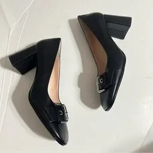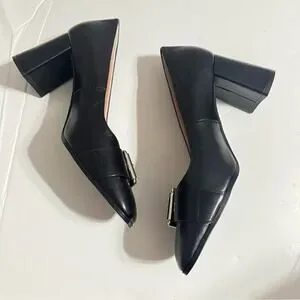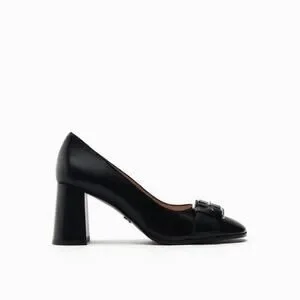 Block heel pumps in leather. Buckle detail at front. Squared toes.