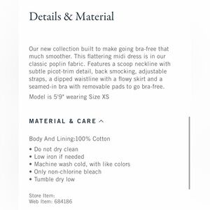 Our new collection built to make going bra-free that much smoother. This flattering midi dress is in our classic poplin fabric. Features a scoop neckline with subtle picot-trim detail, back smocking, adjustable straps, a dipped waistline with a flowy skirt and a seamed-in bra with removable pads to go bra-free.