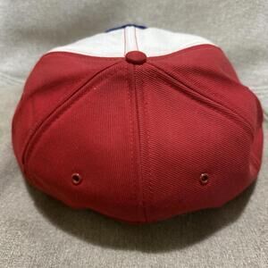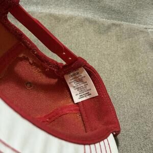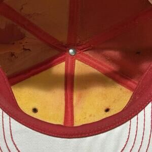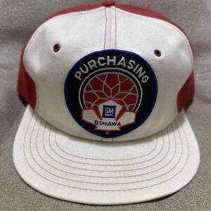 Vintage GM Oshawa Purchasing trucker hat in red and white. Features embroidered front patch and multi-row stitched brim. Foam interior shows heavy deterioration and discoloration (see photos). Exterior has marks and signs of age. Adjustable snapback closure. Great collectible piece for GM or automotive enthusiasts.