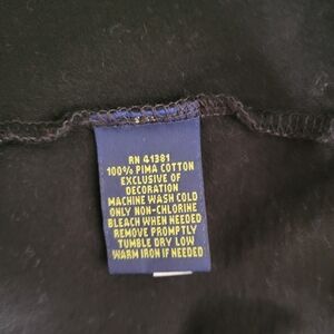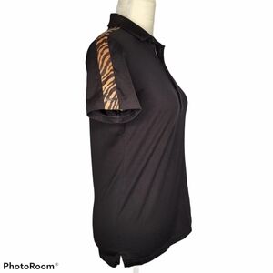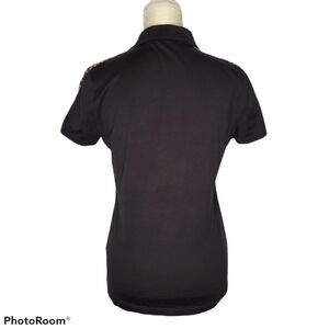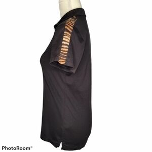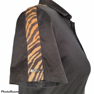 Tailored fit golf polo shirt, black with orange tiger stripes on shoulders, signature embroidered black pony on chest, 100% Pima cotton, size medium.