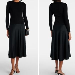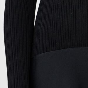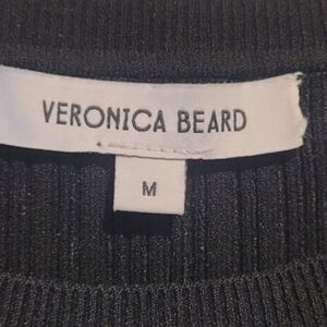 The Veronica Beard Vaughn Dress features a ribbed knit bodice, a crewneck, and long sleeves. This midi length dress has a lightweight stretch crepe skirt. Size medium.