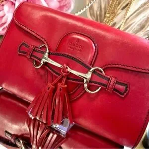 Luxurious red leather crossbody with decorative tassel. Silver-tone horsebit detail and chain strap. Clean stitched trim and elegant silhouette. Timeless Gucci style for day or night.