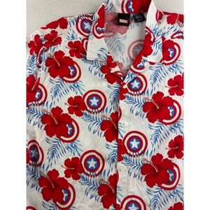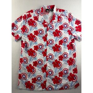 Marvel Captain America Mens Large White Red Blue Floral Shield Rayon Shirt LG