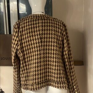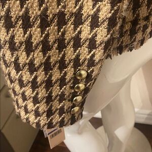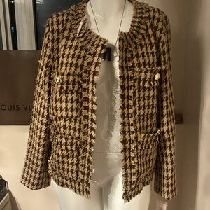Look like Chanel copy Elevate your style with this chic tweed blazer with pockets and gold buttons. Featuring a classic black and tan pattern, it's perfect for any occasion. The elegant design adds a touch of sophistication to your wardrobe.