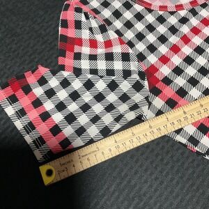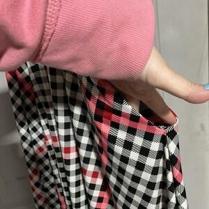 Color/Pattern: Multicolor plaid check in black, white, and shades of pink and red on a light background.