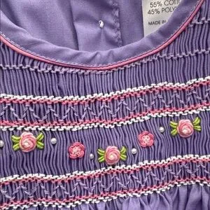 Absolutely beautiful in excellent like new condition. Smocking with little rosettes and pearls. Measurements: 12” armpit to armpit. 26” shoulder to hem. Smoke free home. Clean and ready to go.
