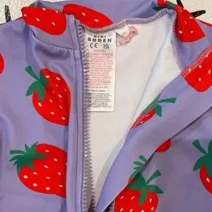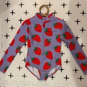 Long-sleeve one-piece swim suit with front zipper. Bright strawberry print across the suit. Soft stretchy fabric for swim play.