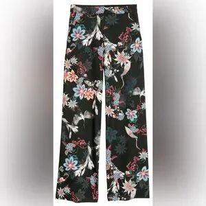 H&M Crane Print Satin Wide Leg Trousers High Waist Floral Size 6