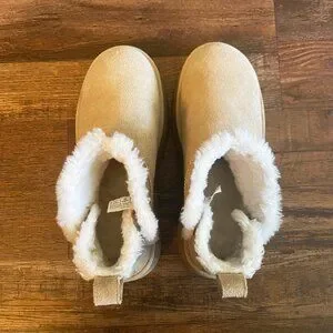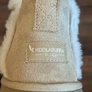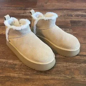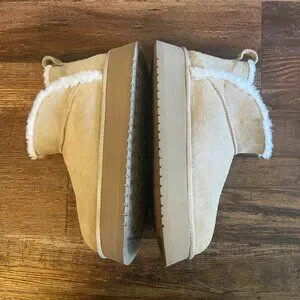 The Koolaburra by UGG Women Koola Ultra Mini Platform Ankle Boot in size 9. Made with suede outsole material and lined with faux fur, these ankle boots are perfect for the winter, fall, and spring seasons. The solid sand color and medium shoe width make them versatile for any outdoor occasion. Designed with a platform heel and ankle shaft style, these boots are a trendy and practical addition to any woman's shoe collection.