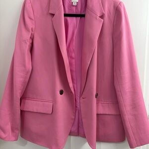 Stylish double-breasted blazer in vibrant pink. Features classic lapels and front pockets. Ideal for a polished look.