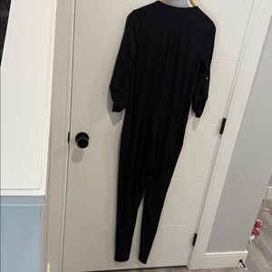 Sleek black jumpsuit with a front zipper closure. Features chest flap pockets and zippered hip pockets. Long sleeves can be rolled and secured. Drawstring waist for a tailored look. Modern, polished silhouette for day or night.