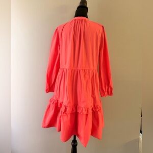 Cotton poplin tiered ruffle mini dress. Lightweight fabric with gentle drape. Simple neckline and relaxed fit. Versatile, feminine piece for everyday wear. It has pockets! Runs big