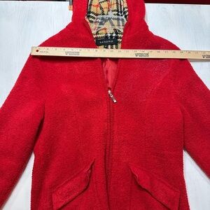 Sandro Paris jacket, boucle teddy jacket, red hooded coat, designer zip-up jacket, women’s medium Sandro, plaid hood lining jacket, Sandro Paris outerwear