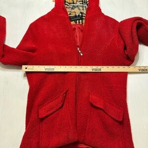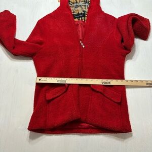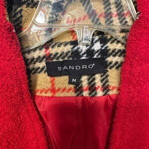 Sandro Paris Red Boucle Teddy Jacket | Plaid Hood Lining | Women’s Size M