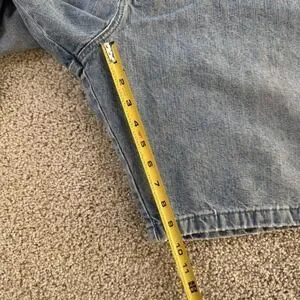 Item: Mens denim cargo carpenter shorts with flat front and zip fly.