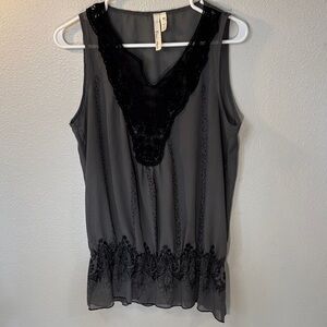 Elegant sleeveless top featuring black lace detail on a gray background. Perfect for a chic look.