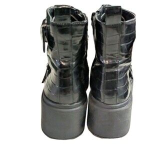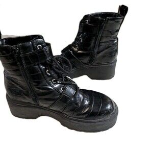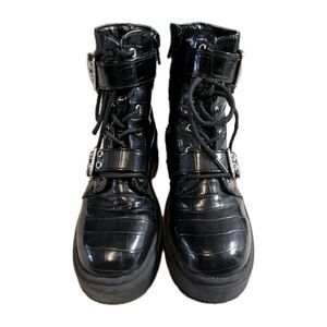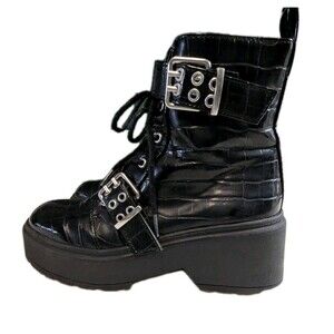 Forever 21 Black Croc Embossed Platform Combat Boots Buckle Moto Goth Sz 5.5