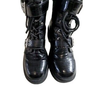 Step out in these bold Forever 21 combat-style boots featuring a striking black crocodile-embossed faux leather finish. These boots combine a rugged silhouette with a trendy edge, featuring dual adjustable buckle straps over a classic lace-up front. The chunky platform and lug sole provide height and traction, while the side zipper allows for easy on-and-off. Perfect for adding a "mob wife" or "goth core" aesthetic to any outfit.