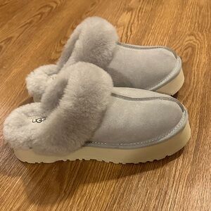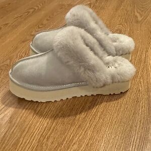 Slip-on mule design with plush shearling lining. Suede upper with soft rounded toe. Cushioned insole for comfort. Easy on-and-off warmth.